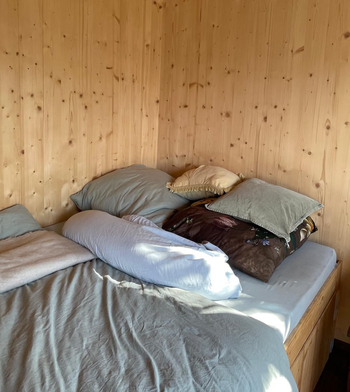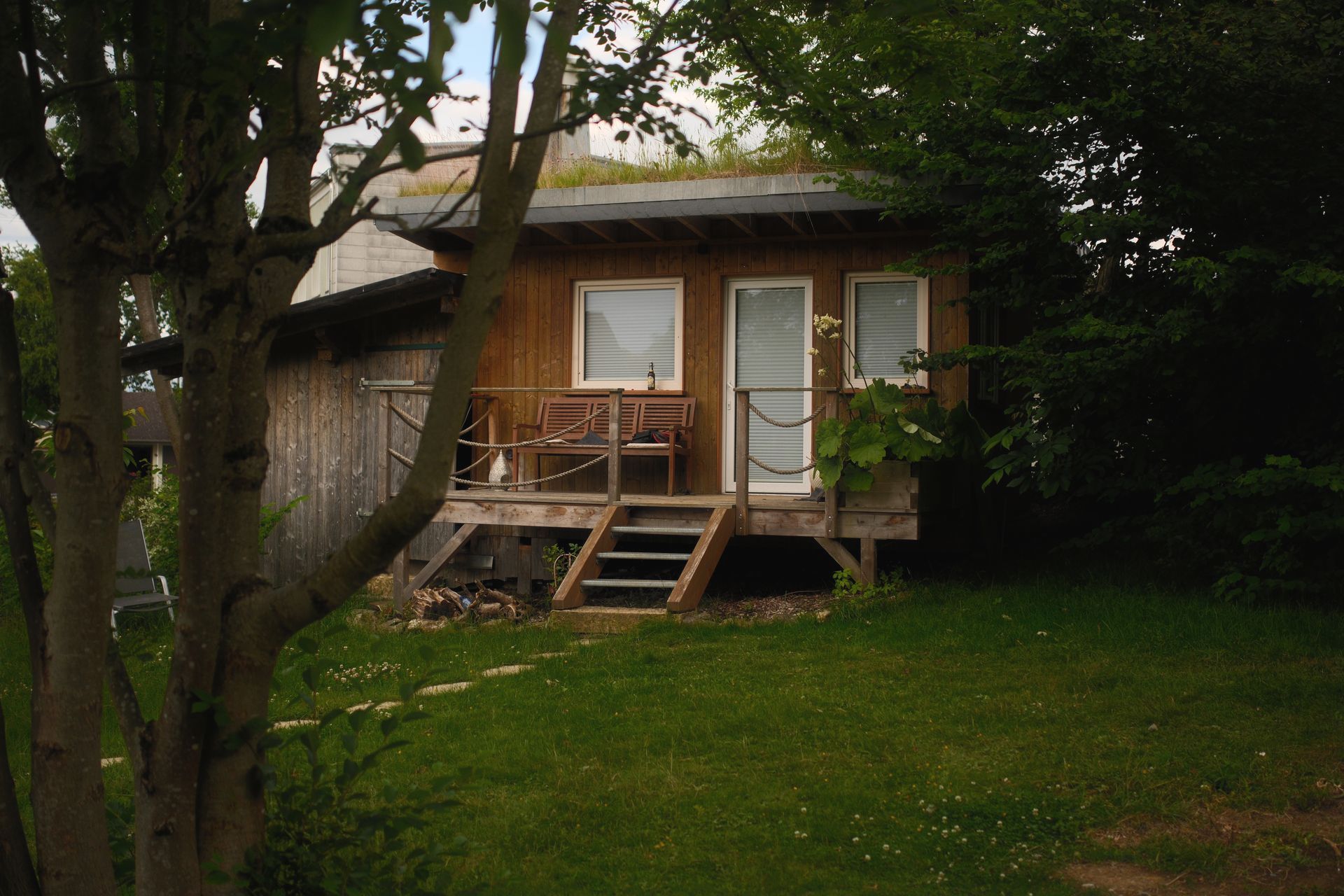 Ihr seid eine größere Gruppe und braucht noch mehr Schlafplätze? Wir bieten euch sehr gerne auf Anfrage unser Tiny House an. Es liegt ebenfalls auf dem Grundstück und bietet Platz für maximal zwei Personen (140x200 Bett). Es verfügt über ein Bad mit Toilette und Dusche, eine offene Küche und einen kleinen Arbeitsplatz mit Blick in den Garten. Es ist schlichter als die Lodges, aber charmant und sehr individuell. Die Buchung geht nur auf direkte Anfrage per E-Mail.