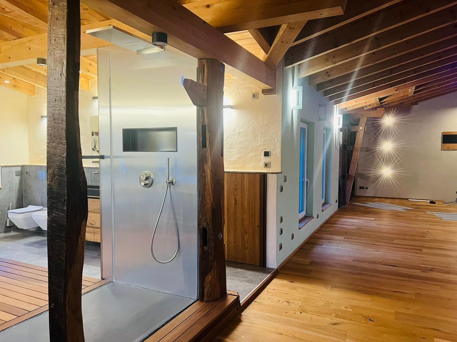 Ein Rückzugsort der Extraklasse: Mit eigener Infrarotsauna, Sunshower, handgefertigten Unikaten und direktem Zugang zur idyllischen Gartenanlage.